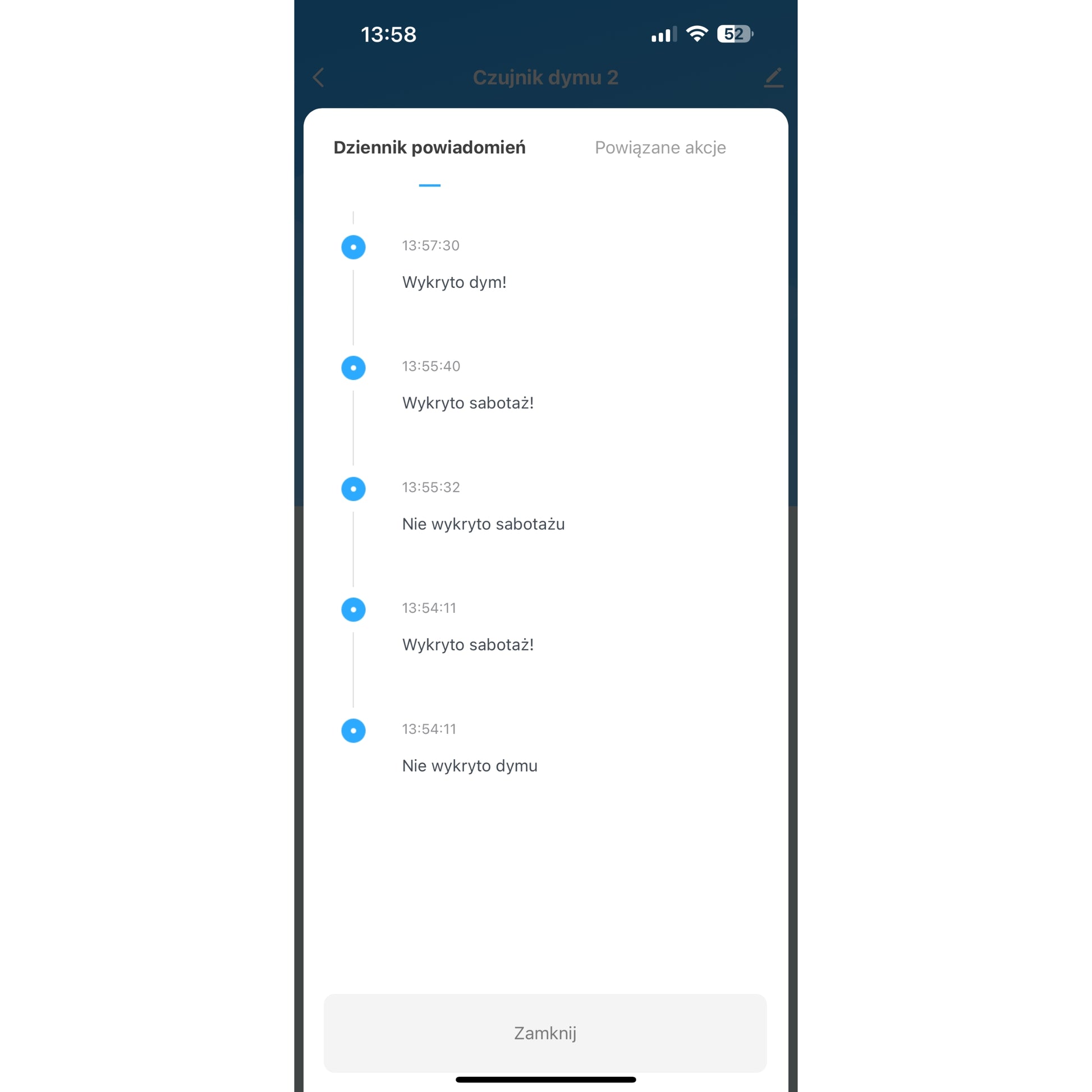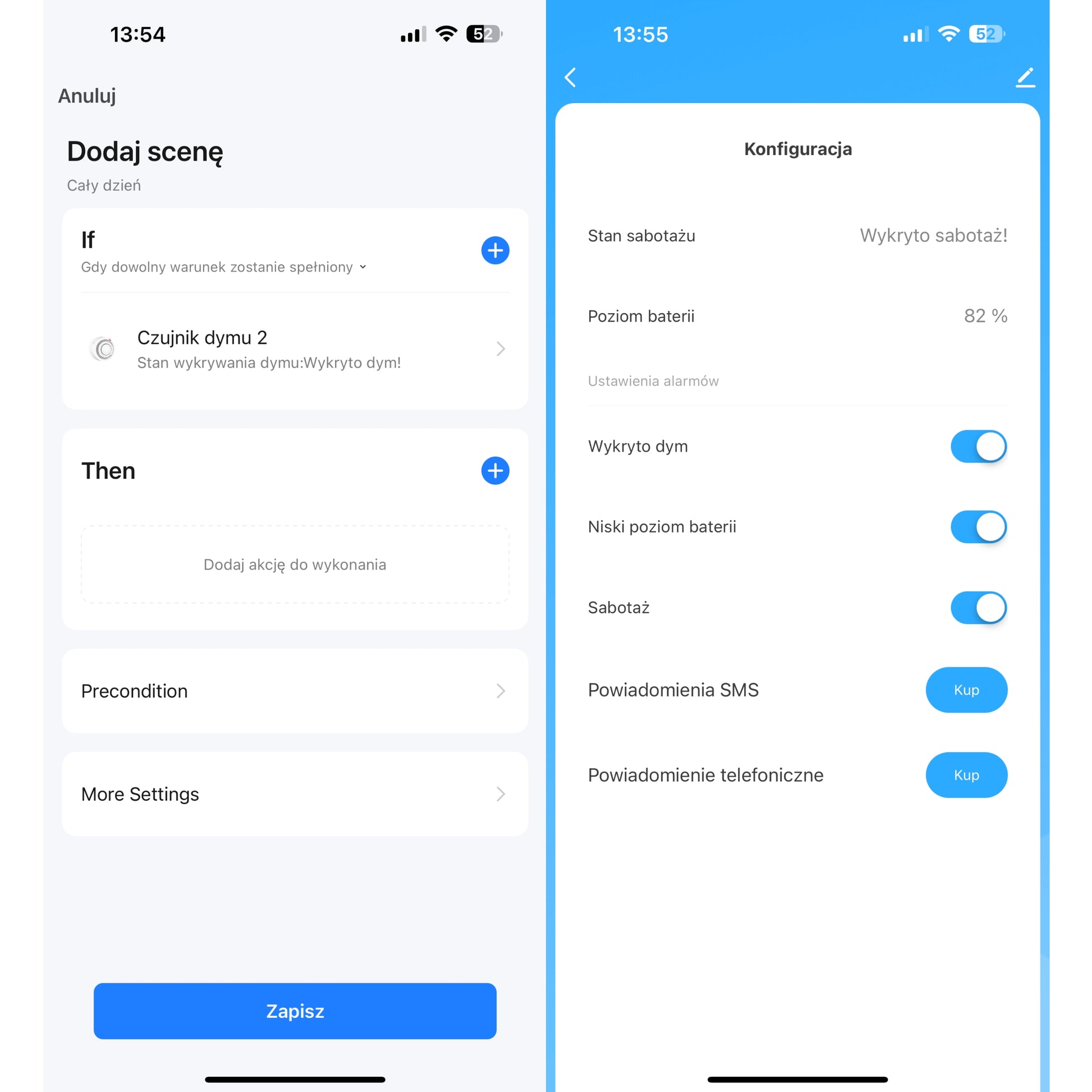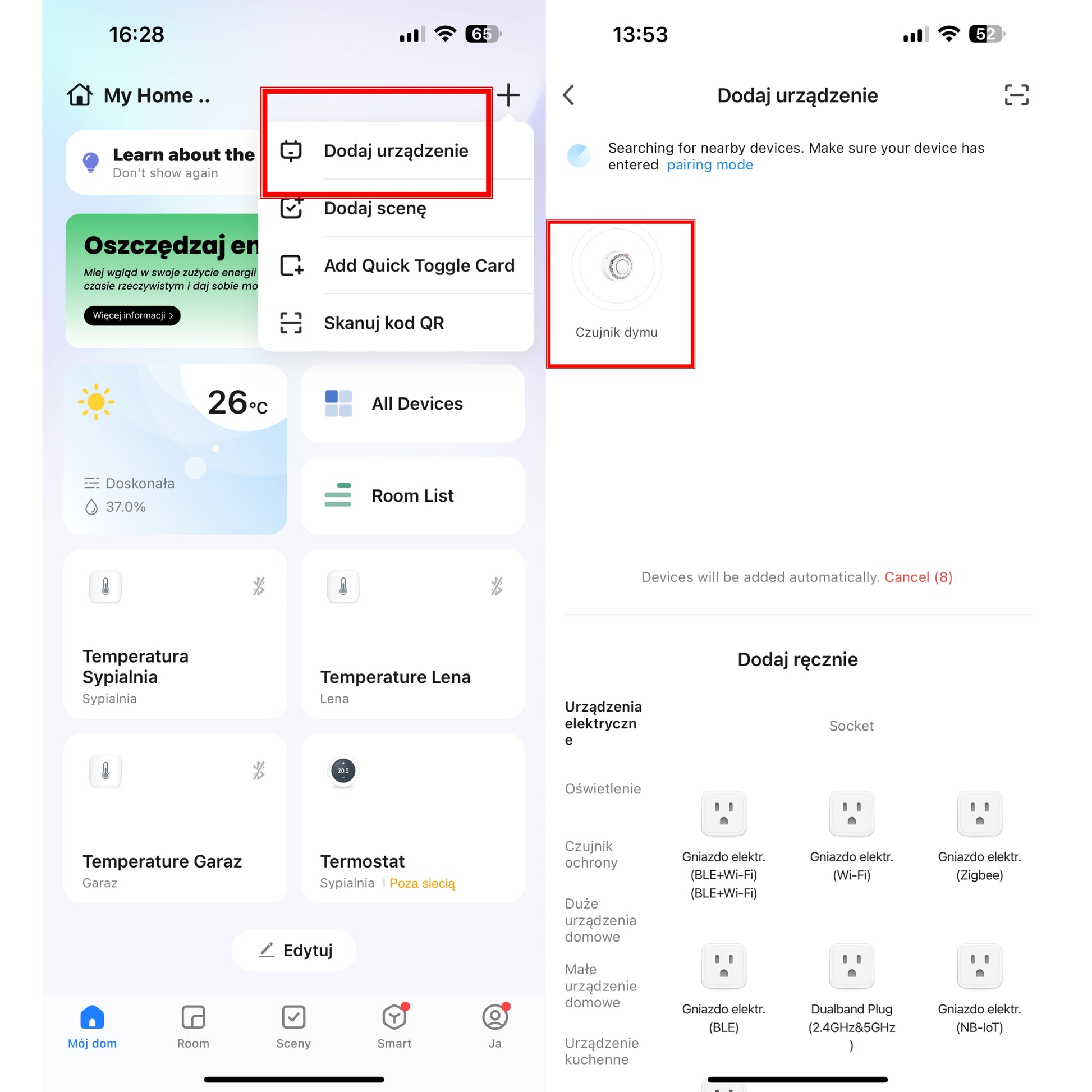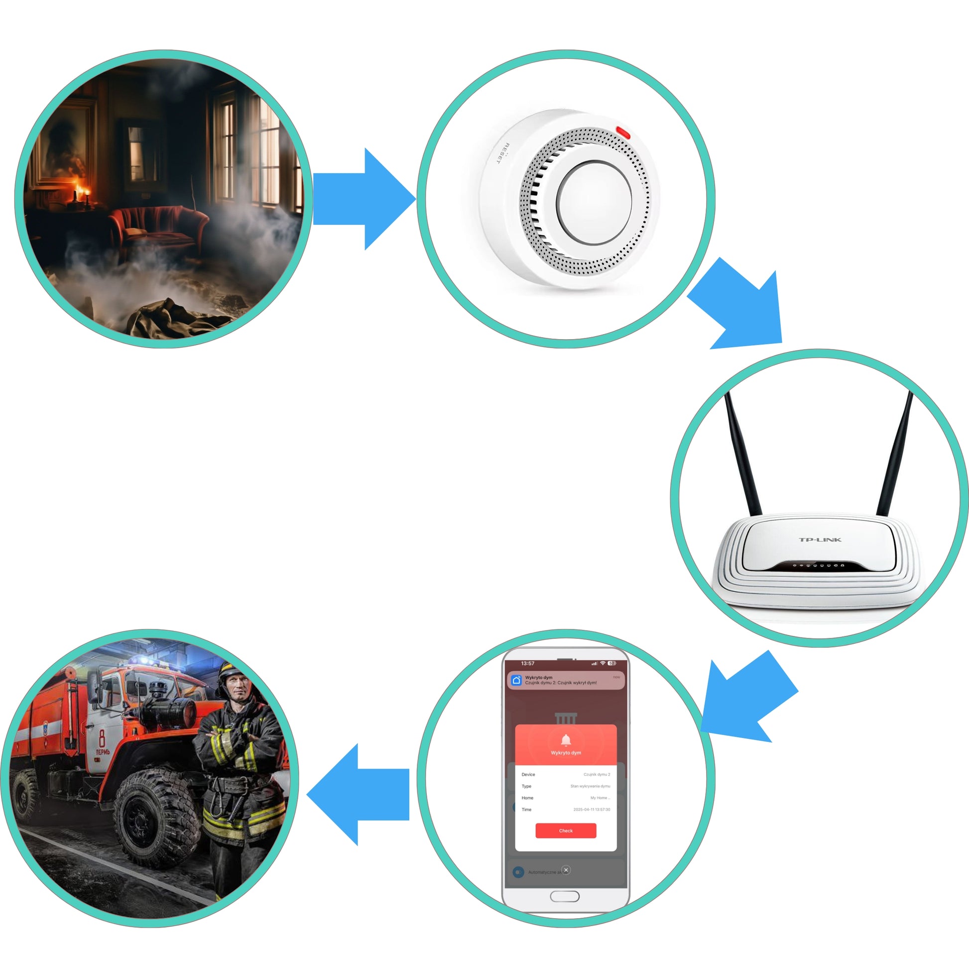 Urządzenie do detekcji i sygnalizacji obecności dymu w pomieszczeniach z powiadomieniem na smartfon w aplikacji systemu inteligentnego domu Tuya